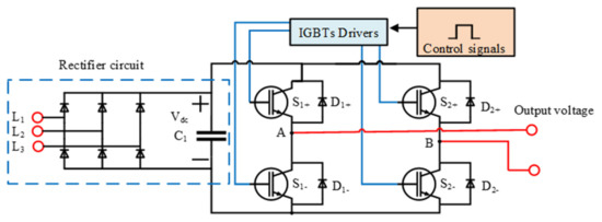 The power frequency converter based on the H-bridge configuration, as shown in Figure 4, was developed. The converter is composed of a rectifier and H-bridge insulated-gate bipolar transistors (IGBTs), which can be controlled to generate either a square wave or pulse width modulation (PWM) waveforms.