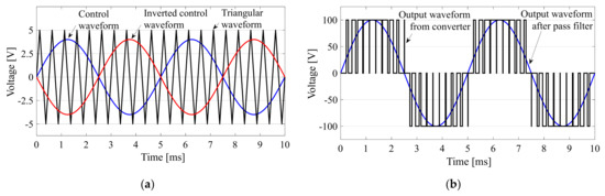 Generated PWM waveform from the PWM converter. (a) Pulse width modulation in the unipolar converter. (b) Output waveform of the power converter.