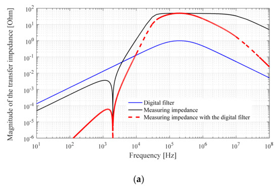 The developed partial discharge detection system is composed of a coupling capacitor (Ck) connected in series with the measuring impedance (coupling device). The capacitance Ck was selected to be 1 nF, and the measuring impedance was designed to have the band-pass characteristic with the equivalent circuit shown in Figure 6. The transfer impedance characteristic with the low and high cut-off frequencies of 30 kHz and 20 MHz, as shown in Figure 7. For avoiding the undesired noise signal in the HV testing environment, the standard [1] recommends using the band pass filter for a quasi-integration of the charge determination, and the acceptable range of cut-off frequencies of the filter are also provided [1]. In this paper, the digital band pass filter with the cut-off frequencies of 100 kHz and 400 kHz is utilized according to the standard requirement. The transfer function of the filter and the transfer impedance with the considered filter are also presented in Figure 7.