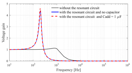 The calculated and normalized transfer function of the testing voltage with and without additional resonant circuit.