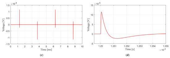 Voltage response of 1 pC calibrator pulse current (a) at the PD port with long span time, (b) at the PD port with short span time, (c) filtered by the band pass filter with long span time, (d) filtered by the band pass filter with short span time.