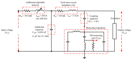 The equivalent circuit of the HV and PD testing system is expressed in Figure 13. All circuit parameters in Figure 13 were transferred to the HV side of the testing transformer. It is noticed on the equivalent circuit in Figure 8 that the inductor will not affect the PD measurement if the PD occurs on the HV side. The transfer function in the form of the attenuation factor (VPD/Vin) can be determined as the results in Figure 14a and the attenuation factor with the band pass filter recommended by the standard are expressed in Figure 14b. The input square wave voltage generated by the converter of 17.1 kV (corresponding to 100 kV output voltage) and the output voltage are expressed in Figure 15. The black line stands for the input voltage of the HV testing transformer (transferred to the HV side of the testing transformer), and the red line stands for the output voltage of the testing transformer or the voltage across the test object. It is noticed that the output voltage waveform is almost pure sine due to the occurrence of resonant condition at the frequency of 200 Hz. It is also confirmed that the quality factor of 4 is sufficient to obtain the waveform as the standard requirement.