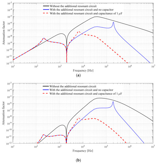 Attenuation factor of the HV and PD testing system. (a) At the PD port without the band pass filter recommended by the standard; (b) at PD port with the band pass filter recommended by the standard.