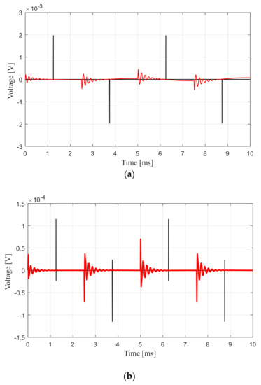 In the results shown in Figure 16 and Figure 17. The black line is denoted for the voltage response of 1 pC calibrator pulse current, and the red line stands for the interference signal at the output voltage of 100 kV. Without the additional capacitor (Cadd), the interference from the square wave as the input voltage of the testing transformer is still high. Additionally, the band pass filter recommended by the standard is not particularly effective for mitigation of the attenuation of the interference signal, as shown in Figure 16. With connection of the additional capacitor (Cadd), the interference is attenuated to be lower than the voltage response of the 1 pC calibrator pulse current. Additionally, the band pass filter recommended by the standard is quite effective for mitigation of attenuation of interference signal as it is shown in Figure 17. In Figure 17b, the maximum interference signal is 0.07 mV, which is equivalent to background noise level of 0.6 pC (0.115 mV is equivalent to the PD level of 1 pC).