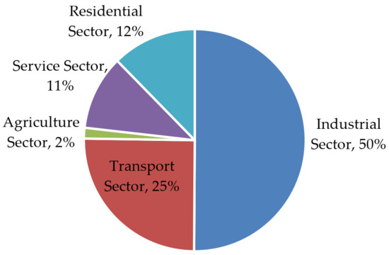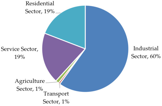 In terms of energy usage, the industrial sector accounts for the greatest proportion of energy consumption in Taiwan, followed by the transportation, residential, and service sectors, accounting for approximately 50%, 25%, 12%, and 11% of the overall energy consumption, respectively, as summarized in Figure 1 [1]. In terms of electricity usage, the industrial sector accounts for the highest proportion (60%) of electricity usage among all sectors, followed by the service and residential sectors, which each account for approximately 19% of the overall electricity consumption, as shown in Figure 2 [1]. Improving the energy efficiency of the industrial sector thus presents the greatest opportunity for reducing Taiwan’s overall energy consumption.