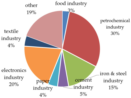 As the energy users belong to different industries and industrial characteristics may affect users’ energy efficiency, users were also classified by industry. Based on their level of energy consumption, priority was given to the petrochemical, electronics, iron and steel, cement, paper, textile, and food industries; their total energy consumption exceeded 80% of the overall energy consumption of the industrial sector, as shown in Figure 3.