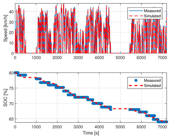 Figure 4 compares the state of charge (SOC) of the baseline EB model in [20] against the measurements for an in-service drive cycle in London. The state of charge (SOC) indicates how much electric energy is left in the battery pack compared to its capacity and it ranges from 0% to 100%. Most commercial vehicles warn the drivers when the SOC goes below a threshold, e.g., 15%, to prevent stranding on the road. The baseline EB model input—measured speed profile—was tracked well by the model’s simulated values. In addition, for the 2 h long urban drive cycle, the baseline EB model’s SOC profile correlated well with the experimental measurements with an error less than 3%.
