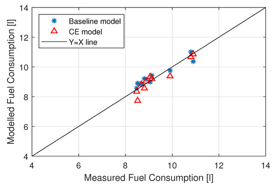 Figure 7 shows the fuel consumption of the proposed CE model and the baseline diesel HGV model versus the measured values.