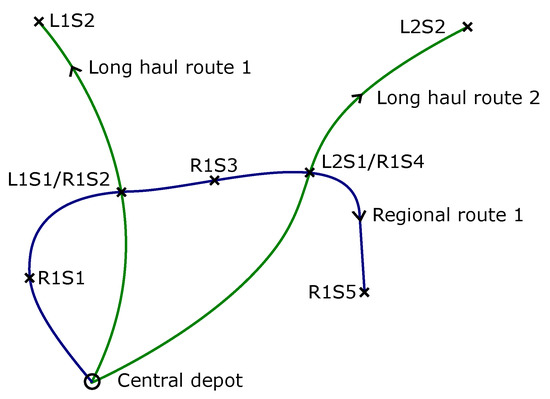 To demonstrate the utility of the CE modelling framework, a brief case study is presented for a hypothetical HGV fleet operator. As shown in Figure 8, the company operates on three routes from a central depot: two of them are long haul with two stops, where the first stop intersects with the third route; the third route is regional with five stops, where the second and fourth stops intersect with the two long haul routes. In Figure 8, LH1S1 and LH1S2 are the first and second stops on the first long haul route; LH2S1 and LH2S2 are the two stops on the second long haul route; and R1S1, R1S2, R1S3, R1S4 and R1S5 are the five stops on the regional route. Among these stops, LH1S1 and R1S2 are two names of the same stop, which lie at the intersection of the regional route and the first long haul route. Similarly, LH2S1 and R1S4 are two names of the same stop, which lie in the intersection of the regional route and the second long haul route.