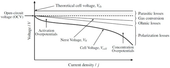 Overall polarization losses are given by the sum of activation and concentration losses. Finally, in the case of unconventional fuel supply to the SOFC, additional losses related to the chemical conversion processes are added [31].