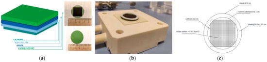 (a) Schematic and geometry of anode-supported SOFC (Ni-YSZ/YSZ/GDC-LSCF) (Ni-Yttria-Stabilized Zirconia/Yttria Stabilized Zirconia/Gadolinia Doped Ceria-Lanthanum Strontium Cobalt Ferrite) used; (b) button cell assembly in the holder; (c) Schematic of net active surface [49].