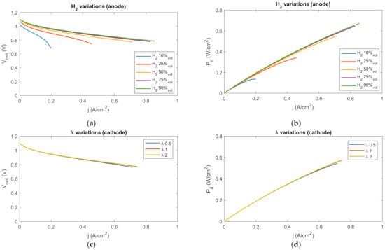 The effect of λ on the IV and IP curves (Figure 6c,d) is hardly appreciated; in fact, only the λ = 0.5 case shows any relevant difference (around 1% difference) with respect to the other analyzed cases (λ = 1; λ = 2). However, by analyzing the UFo (Figure 7c,d), even with λ = 0.5, the O2 stoichiometry is always met (maximum UFo ≈ 0.5) due to the low values of UFf. Aligned to what was described for H2 content, lower λ cases entail higher oxidant ratios since at equal current more oxidant is consumed with respect to the cathode inlet flow. In this way lower λ cases can achieve higher UFo values and can obtain higher voltage levels at equal UFo, since the cell current required is lower, entailing lower overpotentials. However, a lower current entail that lower λ cases achieve lower power at equal UFo values with respect to higher λ cases. Overall, from the obtained results it seems that a variation of the cathode flow in the analyzed range does not significantly affect the cell performance.