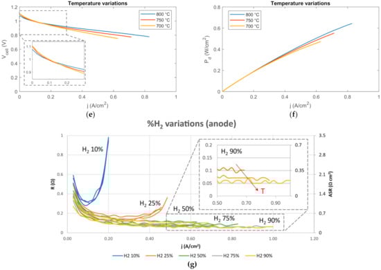 Experimental performance voltage & power curves: (a,b) H2%vol variations (T = 750 °C; λ = 1.4); (c,d) λ variations (T = 750 °C; H2 50%vol); (e,f) IV curve for T variations (H2 50%vol; λ = 1.4); (g) Resistance and Area Specific Resistance curve for H2%vol variations (T = 750 °C; λ = 1.4).