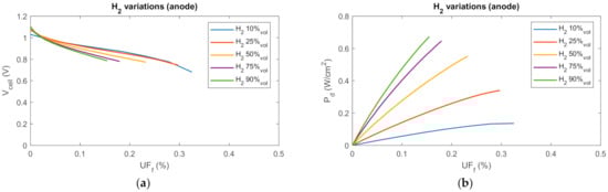 From Figure 6a it can be observed that higher H2 concentrations (50%; 75%; 90%) show reduced voltage drops (i.e., reduced both activation and concentration losses), longer IV curves (reaching current values up to around 0.7–0.85 A/cm2 without dropping the voltage below the 750 mV threshold) and a more linear behavior, increasing the permanence in the ohmic region. On the other hand, a reduced H2 content (10%; 25%) shows shorter IV curves with voltage drops due to concentration losses occurring in an earlier stage (the voltage threshold is reached for values of current as low as 0.3–0.4 A/cm2 for H2 25%vol and below 0.3 A/cm2 A for H2 10%vol). This is attributable to a higher fuel content which improves both the thermodynamic (Equation (4)) and the kinetics of the cell reactions, by increasing the available gas which can be oxidized at the active sites of the TPB. The effects observed in the IV curve are reflected in the IP curve (Figure 6b), where high H2%vol cases achieve higher maximum power values (around 0.7 W/cm2) with rather linear trend, lower H2%vol cases generate lower power (as low as 0.15 W/cm2 for H2 10%vol) and show a power loss with non-linear tendency due to the concentration losses. On the other hand, an increased inlet H2 concentration entails lower UFf at equal current loading (Figure 7a) since the fuel inlet flow rate is increasing (Equation (6)). On one hand higher UFf values can be achieved with lower H2%vol cases. This is because at equal current, more fuel is being consumed with respect to the inlet flow. On the other hand, lower UFf cases suffer lower performances: in fact, from a power point of view (Figure 7b), higher UFf cases (lower H2%vol) achieve lower output power. This aspect is relevant in fuel cell stacks, where a trade-off must be found between stack performance and fuel utilization in each cell unit [34,56].