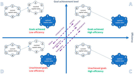 - Section C of Figure 1 can be considered somewhat worse than B (although this depends on the strategy of the firm and the priorities of the shareholders), because the company is efficient (balances its capitals) but does not achieve its goals. Such a situation inhibits the development of the company and might entail legal, financial, or personnel-related consequences associated with the non-achievement of goals.