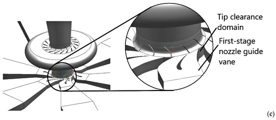 Figure 3a–c shows the set-up of the computational domain which consisted of nine domains: the exhaust pipes, the first-stage nozzle vanes, the first-stage turbine rotor, the tip clearance gap, the diffuser, the inter-stage pipes, the second-stage nozzle vanes (variable), the second-stage turbine rotor and the outlet. The same rotor geometry was used for the first and second-stage. The rotors were installed on a single shaft, thus the rotational velocity of the rotors was the same.