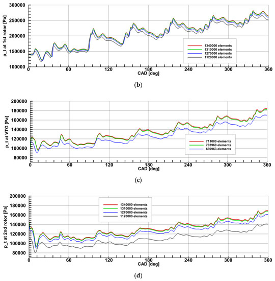The total pressure plot against different number of elements during the single revolution of the crankshaft for the: (a) exhaust pipe, (b) first-stage rotor, (c) second-stage nozzle vanes, (d) second-stage rotor.