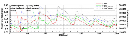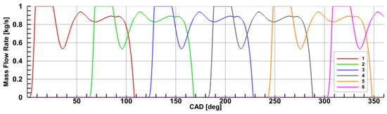 The ANSYS FLUENT software was used for transient simulations. For this reason, the sliding mesh method was used to capture the instantaneous parameters during the single time step. For the inlet of each exhaust pipe, the mass flow inlet boundary condition was set. The mass flow rate profile at the inlet to each exhaust pipe is shown in Figure 6.