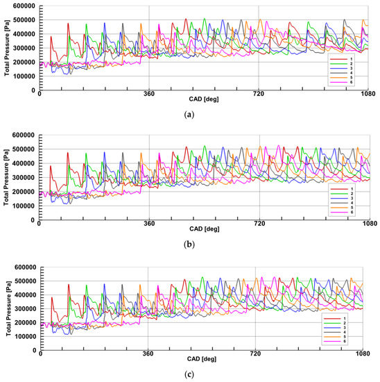 Figure 7 shows that for every turbine speed the pressure variations for each exhaust pipe were almost similar during the 3rd revolution of the crankshaft except for the 40,000 rpm case. The shapes of the pressure plot for each exhaust pipe were different in this case. For the 40,000 rpm case, the maximal pressure values during the 3rd revolution of the crankshaft changed from 485,000 Pa for the exhaust pipe 2 to 502,500 Pa for the exhaust pipe 5. However, such a difference was within the acceptable range. The minor changes can be observed between the 3rd and 2nd revolution of the crankshaft. However, based on the author’s previous experiences, the results for the 4th revolution of the crankshaft were not presented as further changes did not exceed 1%. That is why the results were presented during the 3rd revolution of the crankshaft.