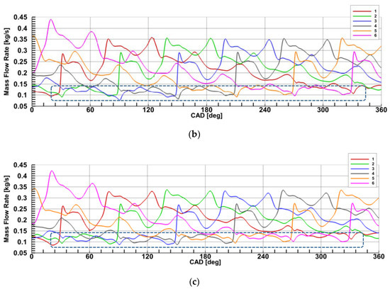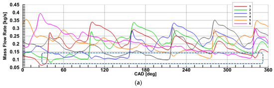 Figure 9 shows the plots of the area-averaged mass flow rate that was monitored in the Section 1-1 for three different turbine speeds. The plots were captured during the 3rd revolution of the crankshaft. For every turbine speed, the shapes of the pressure plots were almost similar and shifted by crank angle degree (CAD). From Figure 8 one can see that the shape of the pressure plot of the exhaust pipe 6 during the exhaust phase differs from the rest of the pressure plots. This pressure plot comes from the 2nd revolution of the crankshaft because of the CAD shift between the exhaust pulses. The shapes of the pressure plots of 40,000 rpm case were different when compared to the pressure plots of 50,000 rpm and 60,000 rpm cases. The dashed rectangle shows the deteriorated mass flow rate at the end of the pulse for every exhaust pipe. Such a phenomenon is shown in Figure 9 in much greater detail.