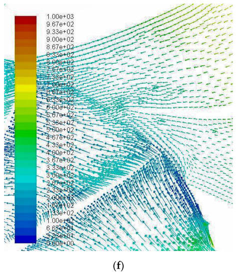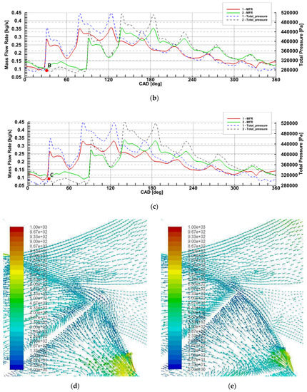 From Figure 10 it can be seen that for 50,000 rpm and 60,000 rpm case the mass flow rate of the exhaust pipe 2 decreased between the and CAD and for the case, between the and CAD. This was associated with the increase of the mass flow rate inside the exhaust pipe 1 due to the opening of the exhaust valve. The lowest value of the pipe 2 mass flow rate was kg/s at CAD for , kg/s at CAD for and kg/s at CAD for The pipe 2 exhaust valve opened at the CAD for every case, this increased the mass flow rate. The interaction between the pipe 1 and pipe 2 mass flow rate after the opening of the pipe 1 exhaust valve was caused by the leakage between those pipes. As it can be seen from Figure 10a–c, between the opening of the pipe 1 exhaust valve and opening of the pipe 2 exhaust valve, first the exhaust pipe 2 operated in lower pressure values due to the end of the exhaust pulse, while the pressure inside the exhaust pipe 1 was at its peak values due to the opening of the exhaust valve. Although, the height of the tip clearance gap was only 3 mm, part of the exhaust gases passed from exhaust pipe 1 to exhaust pipe 2. Also Figure 10d–f show the velocity vectors at the state represented by the points A–C on the mass flow rate plots. The figures clearly show the leakage between the adjacent exhaust pipes with velocity vectors entering exhaust pipe 2 in the upstream direction. The lowest leakage was observed at point C for while the highest leakage was observed at point A for . At the rotor caused the lowest acceleration of the exhaust gases. That is why a larger portion of the exhaust gases passed through the tip clearance gap. However, no negative values of the pipe 2 mass flow rate were observed. This means that no backflow of the exhaust gases from pipe 1 to pipe 2 occurred.