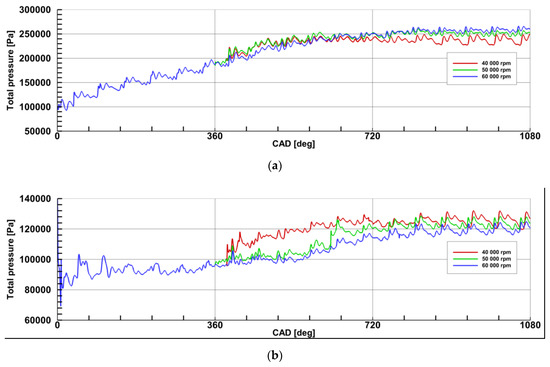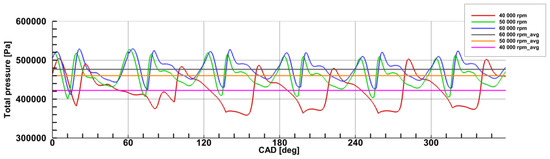 From Figure 12 it can be seen that during the 3rd revolution of the crankshaft the pressure was changing in a quasi-constant manner for every turbine speed. The average pressure values were Pa, Pa, and Pa for , and case, respectively. Such differences between the pressure values for 40,000 rpm, 50,000 rpm and 60,000 rpm were caused by the increasing pressure ratio.