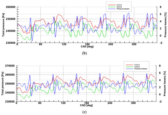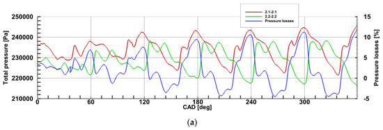 To investigate the pressure losses caused by the inter-stage pipes, the pressure values were monitored at the Sections 2.1-2.1 and 2.2-2.2. The results are shown in Figure 14 during the 3rd revolution of the crankshaft for three different turbine speeds. The instantaneous pressure losses were marked as percentage loss of the pressure monitored at the Section 2.1-2.1. The highest variations of the pressure losses can be seen in Figure 14a for 40,000 rpm case. The pressure losses, in this case, reached up to 12%. This might be caused by the lower acceleration of the exhaust gasses behind the first-stage rotor and vortices occurring inside the inter-stage pipes. For the turbine speed of 50,000 rpm and 60,000 rpm case, the pressure losses were the lowest. In those cases, the highest value of the instantaneous pressure losses reached up to 6%.