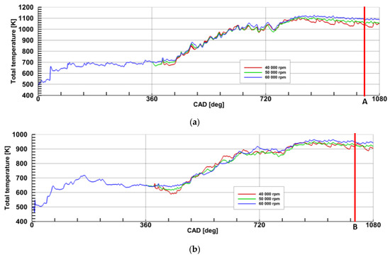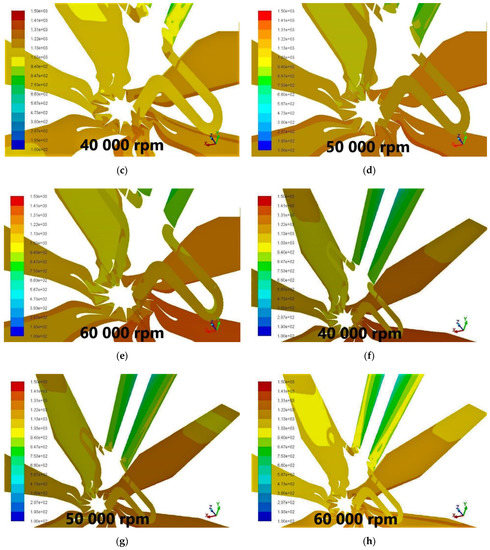 The temperatures at the outlet from both rotors are shown in Figure 16. From Figure 16 one can see that the temperature behind the first and second-stage rotor became quasi-constant during the 3rd revolution of the crankshaft. It was found that, with the increase of the turbine speed, the temperature at the outlet increased. The reason for such a phenomenon is not known. A great difference between the temperatures at the Sections 2-2 and 4-4 can be observed which resulted in the recovery of the energy from the exhaust gases on the first and second-stage rotor. Figure 16c–e show the contours of the total temperature behind the first-stage rotor at state A for the 40,000 rpm, 50,000 rpm and 60,000 rpm case respectively. On the other hand, Figure 16f–h show the temperature contours behind the second-stage rotor at state B. It can be seen that the temperature drops behind the second-stage rotor. However, minor temperature changes can be seen behind the first stage rotor.