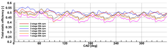 In Figure 17 one can see the variation of the total-static efficiency of the first and second-stage rotor during the 3rd revolution of the crankshaft for the three different turbine speeds. The efficiency during the 3rd revolution of the crankshaft was oscillating in a narrow range for every turbine speed. With the increase of the turbine speed, the efficiency of the first-stage rotor decreased. It was mainly caused by the presence of the second-stage rotor which increases the pressure behind the first-stage rotor and thus, lowers its pressure ratio. For the first-stage rotor, the highest efficiency was 0.89 for 40,000 rpm case. A completely different situation was observed for the efficiency values of the second-stage rotor. The efficiency values increased with the increase of the turbine speed. The highest efficiency value was 0.62 for the 60,000 rpm case. The high-efficiency values of the first-stage rotor were caused by the considerably higher inlet pressure and higher enthalpy drop. The efficiency of the complete two-stage system can be calculated using the formula below: