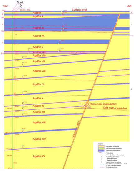 Calculations revealed that the maximum expected total water inflow is 14 m3/min. Considering fractured and cavernous rock mass (Triassic formation) and pressurized groundwater in some aquifers, the possibility of sudden uncontrolled water inflow to the shaft was recognized as a real threat. Depth intervals in the permeable Carboniferous formations in which the average value of the linear slit index is greater than or equal to double the average value of this index for the aquifer were specified, as well as areas of increased values of RQD, which might be an indicator of increased accumulation of water. Data gathered during drilling show a risk of fault zones occurrence on depths of 109.8, 461.8, 462.8, and 570.5 m below the surface.