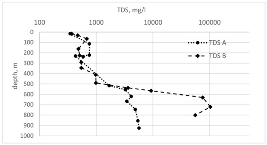 Total dissolved solids (TDS) profile in boreholes A and B.
