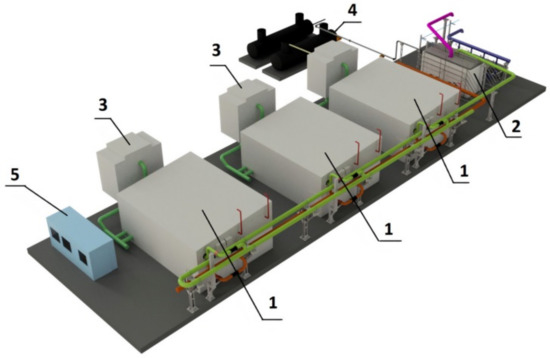 Model of the primary system of freezing installation: 1—cooling aggregates, 2—brine tank, 3—cooling towers, 4—discharge tank, 5—water treatment station.