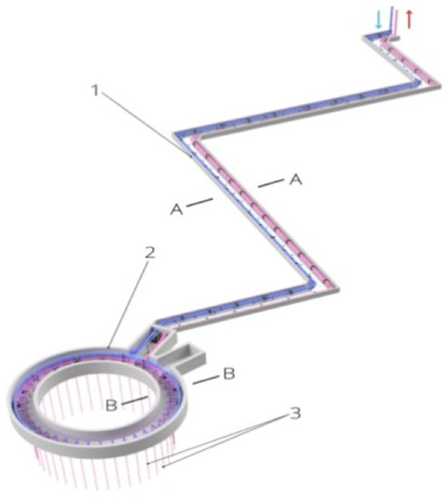 Secondary system of the freezing installation: 1—freezing channel, 2—freezing ring, 3—freezing boreholes.