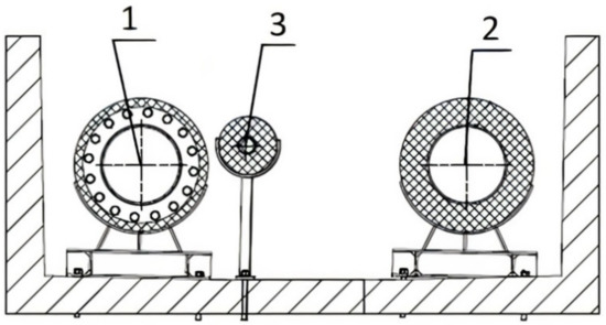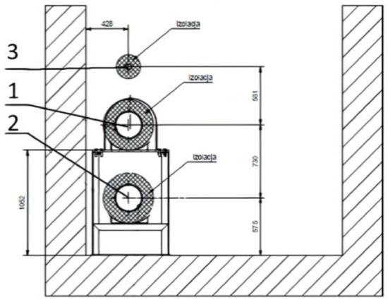 The following figures present elements of freezing installation, including the model of the primary system in Figure 5, the model of the secondary system in Figure 6, the cross section of freezing channel between refrigeration plant and shaft in Figure 7, and the cross section of freezing ring in Figure 8. The primary system includes three freezing units, so-called chillers PAC SAB 283 E eco, in which the freezing medium is ammonia. They are cooled by cooling towers Evapco AT 18-3M14. The refrigeration plant also consists of isolated pipes for medium transfer, a brine tank, a discharge tank, a water treatment station, eight pumps, and an armature. The secondary system is basically a channel comprising pipelines used to transfer coolant from refrigeration plant to freezing boreholes and back. The channel consists of two main parts, one of them is a freezing ring and the other one is a channel between the freezing ring and the refrigeration plant. The freezing channel contains two pipelines with a diameter of 350 mm—inlet and outlet pipelines and one venting pipeline with a diameter of 65 mm. Around the shaft outline, pipelines are circle-shaped. The freezing boreholes’ pipes are connected directly to pipelines in the freezing ring.