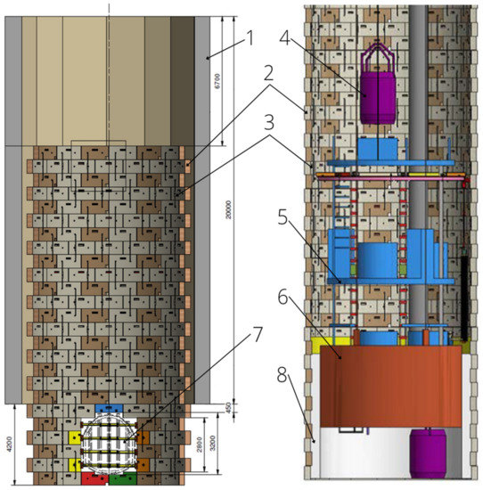 Layout of the shaft lining: 1—diagram wall, 2 –concrete panel (grey—standard panel; brown—panel with gaps for concreting; yellow, blue, red, green, orange—special construction panel), 3—panel fasteners, 4—sinking bucket, 5—suspended stage, 6—steel formwork, 7—inlet of backfill pipeline channel, 8—final concrete lining.