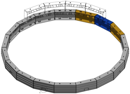 Layout of the steel sections ring (grey panels—typical segments, blue and orange panels—closing segments).