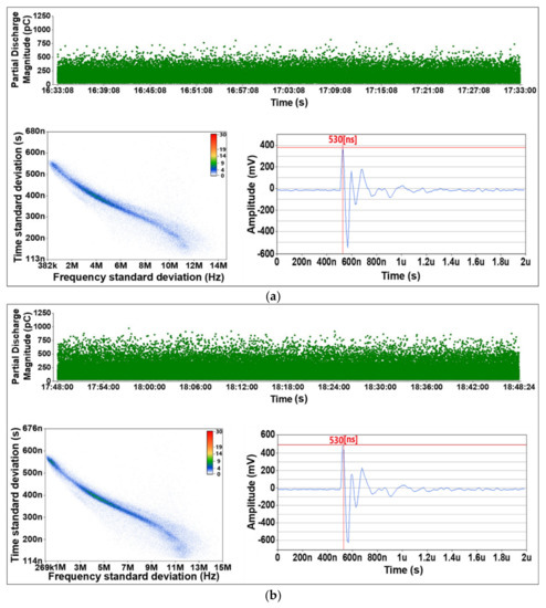 The PDMS device analyzes the partial discharge pulse by classifying it in four ways, as shown in Figure 5. Zone ① records the occurrence time and magnitude of a partial discharge pulse in real time, from which the difference between occurrence time and magnitude of void discharge applied to the PSA can be obtained. Zone ② is a TF-map that shows the frequency standard deviation and time standard deviation of the partial discharge pulse, allowing for the partial discharge signal to be distinguished from the noise. Zone ③ shows the shape of partial discharge pulses generated in real time, like an oscilloscope.