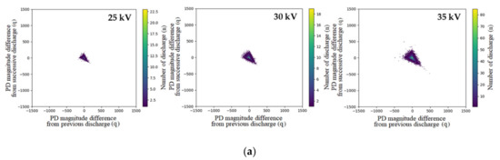 In DC void discharge, the magnitude of the discharge differs according to the residual voltage and the statistical time lag of the void discharge [33]. Therefore, when pattern analysis is performed using the previous discharge difference (=) vs. successive discharge difference (=) method, the pattern is widely distributed.