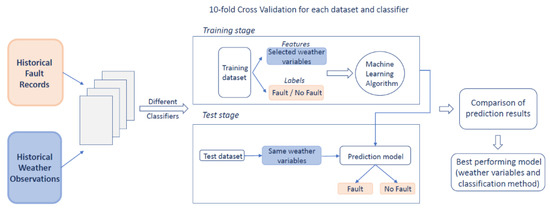 The diagram shown in Figure 1 gives an overview of how the weather variables are analysed in conjunction with the fault records in order to identify a suitable fault prediction model. The different stages of the methodology from the dataset development to the selection of the fault prediction model of Figure 1 are detailed in Section 2 and Section 3 of this paper, which discuss the data used and the data analysis process, respectively.