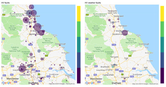 HV faults in NPG distribution network licence area–darker colour of circles indicates lower CML (Left: all faults, Right: weather related faults).