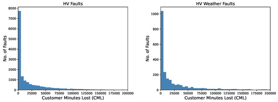 Distribution of the CML that resulted from the HV faults in NPG distribution network licence area (left: all faults, right: weather related faults).