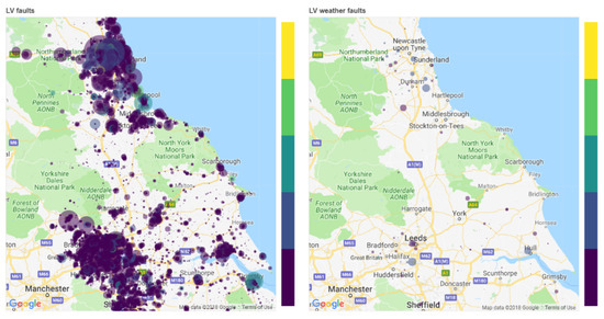 LV faults in NPG distribution network licence area–darker colour of circles indicates lower CML (left: all faults, right: weather related faults).