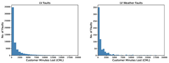 Figure 5 shows a similar distribution to Figure 3, in that the majority of faults have a low CML; unlike HV, the distribution tail is heavier, indicating the potential for longer (although with fewer customers affected) CML from weather related faults-this may be exacerbated by the lack of automation on distribution networks, necessitating manual restoration of power or replacement of damaged components.