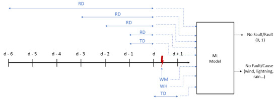 Timeline for selection of the 4 groups of weather variables approaching a fault occurrence classification (d is the day of each fault or no fault example). The codes RD, TD, WM and WH correspond to subsets of the weather variables shown in Table 3. Each group includes the following variables. RD: 1–4, TD: 5–8, WM: 9–12 and WH: 13–19.