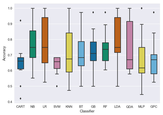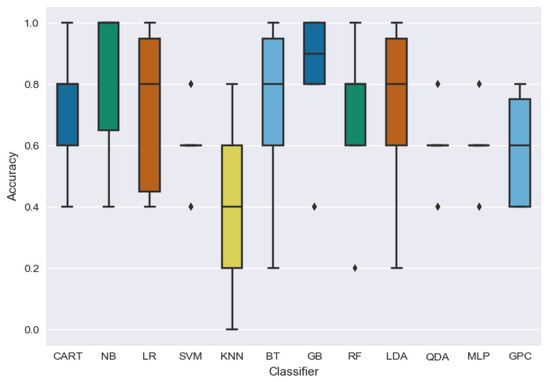 The above results show that the average classification accuracy of the Naive Bayes classifier was the same as that of Gradient Boost (). However, due the range of accuracies during cross validation being larger in the case of Naive Bayes, Gradient Boost was selected as the best performing classifier. The dataset was randomly split into the train and test sets (80–20% respectively) and the classification results on the held-out test set are shown with the confusion matrix and the performance metrics of Figure 10.