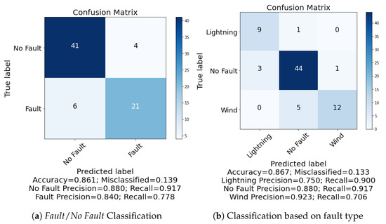 It can be seen that, for this randomly chosen test set, the overall classification accuracy when using LDA is . The model correctly classified 44 out of the 48 No Fault examples and 21 out of 27 Fault examples. Even though there are more Fault than No Fault examples that were misclassified, the accuracy is high considering the fact that only weather variables have been used to predict the occurrence of a fault. The same process was repeated in order to classify the faults based on their cause and the results are shown in Figure 8b.