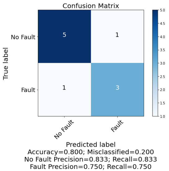 After removing the 7 Fault examples mentioned above, of the remaining dataset was used for training and for testing. Using LDA, which was the best performing classifier, the classification results on the held-out test set (48 No Fault and 27 Fault examples) are shown in Figure 8a, which shows the confusion matrix for this classification’s results and the relevant performance metrics.