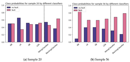 Figure 11a shows the probabilities for sample 20 of the test set. Sample 20 corresponds to a No Fault example that was correctly classified by the voting classifier but missed by stacking. It can be seen from this figure that sample 20 is a difficult to predict example as the majority of individual estimators give probability close to for both labels, with only LR giving a higher probability to No Fault, although still not very high. Using the probabilities of prediction as well as the labels, Voting classifier managed to correctly predict sample 20 as No Fault, as opposed to the Stacking classifier which uses the predictions only. Figure 11b shows the probabilities for sample 56, which is a No Fault example that was misclassified by all classifiers. Although both ensemble methods made a wrong prediction (as all classifiers in this case), the label probabilities show that the Fault prediction made by the Voting classifier was with less confidence than that of Stacking.