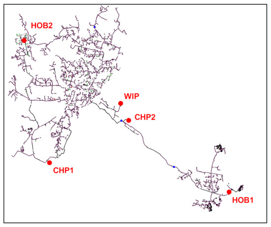 The analysis of the volume of water losses was made using the example of the DHS in Szczecin, a diagram of which is shown in Figure 1. It is one of the largest DHSs in Poland and it has average level leak-tightness (the annual water exchange ratio is about 5.5). Heat is produced in five heat sources: two combined heat and power plants (CHP1, CHP2), two heating only boilers (HOB1, HOB2), and one municipal waste incineration plant (WIP). At present, all heat sources work on a common DHN, following the principles of heat source cooperation [23] and are switched on depending on the city’s heat demand. The heat is supplied to about 2200 substations through a pipeline network. The total length of the DHN is about 300 km, and its water volume is .