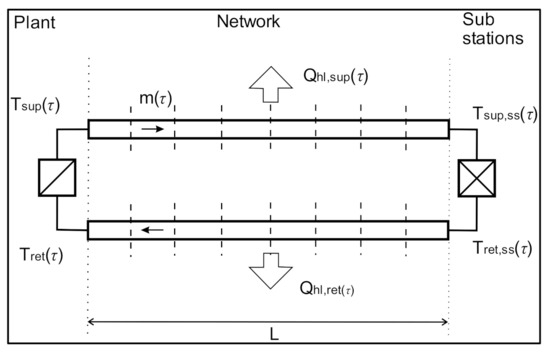 The most important part of the presented DHS model is its simplified DHN model. The DHN model is a substitute pipeline with length calculated according to Equation (14). The volume of the pipeline is equal to the actual water volume of the DHN. The value of the inner diameter of the pipeline should be calculated according to Equation (15). The replacement pipeline’s heat loss is equal to the actual heat loss of the entire DHN.